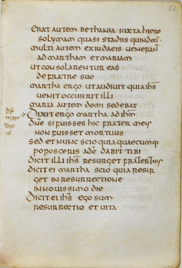 Page from the St Cuthbert Gospel relating part of the story of Lazarus. The contemporary marginal note 'de mortuorum', marks out a page to be read at masses for the dead (Add MS 89000, f. 51r).