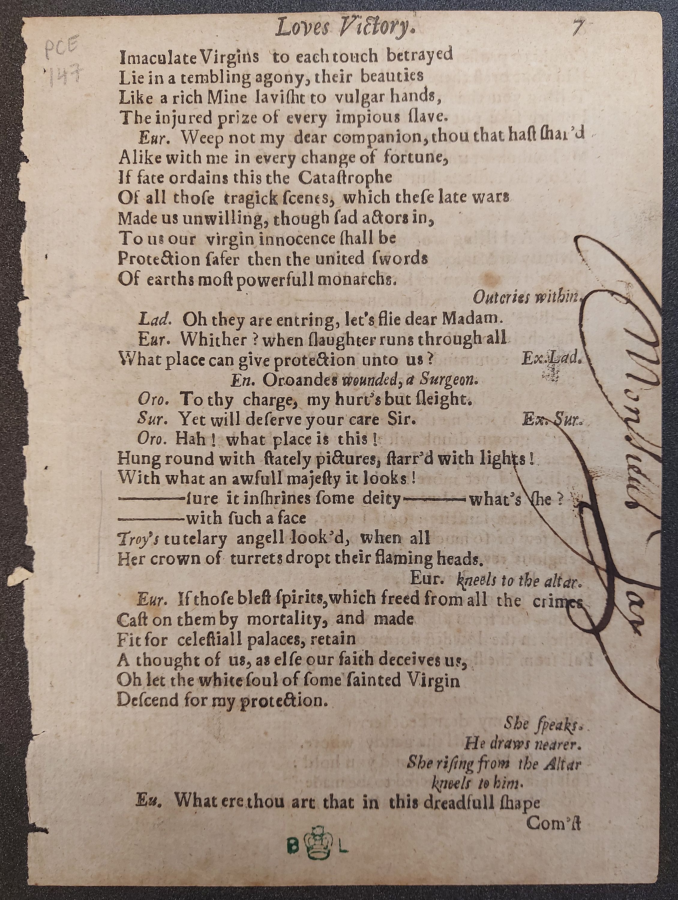 This leaf from Loves Victory: a Tragi-comedy by William Chamberlayne (London: E. Cotes, 1658) has the name of a previous owner, 'Monsieur Jay', written vertically in the outer margin (Ashley Add 9).